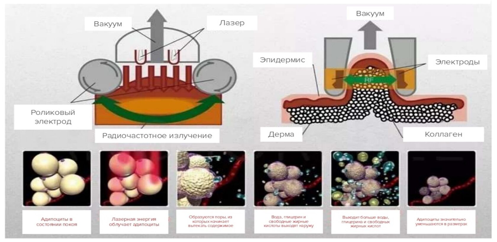 Аппарат сочетает в себе четыре различные технологии — инфракрасную, радиочастотную, импульсно-вакуумную и массажные ролики для улучшения текстуры кожи и уменьшения общего объема обрабатываемой области.